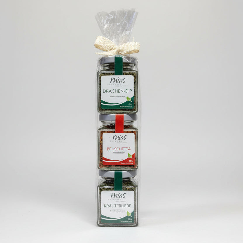 Entdecke unsere vielseitigen 3er-Geschenkstangen mit vorausgewählten Variationen! Jede Stange beinhaltet drei kleine Gläser, sorgfältig zusammengestellt aus unseren verschiedenen Bruschette und Dips. Verwöhne deine Freunde mit dieser genussvollen Geschenkidee, die eine Auswahl deiner Lieblingssorten in eine Verpackung vereint.