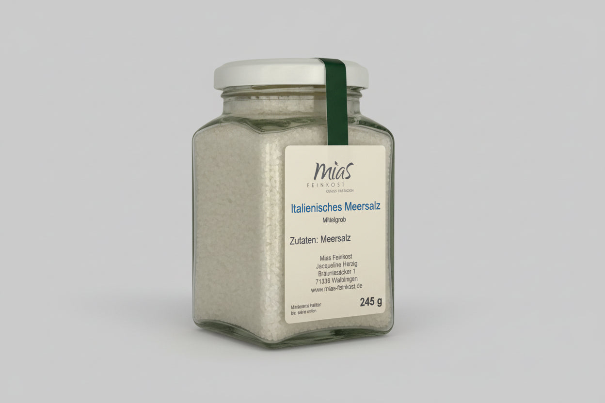 Unser Sale Marino Medio ist ein hochwertiges italienisches Meersalz mit mittelgrober Körnung. Gewonnen aus sonnengetrocknetem Meerwasser, überzeugt es durch seinen reinen, ausgewogenen Salzgeschmack und seine vielseitige Einsetzbarkeit in der Küche.