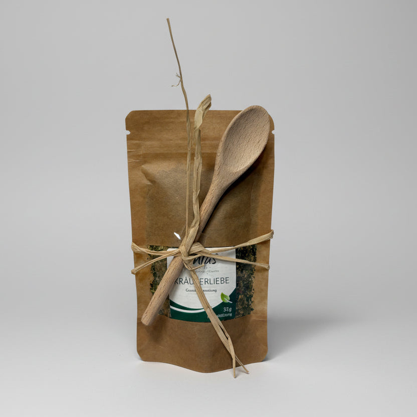 Der GENUSSLÖFFEL ist ein liebevoll gebundenes Feinkost-Mitbringsel. Eine aromatische Gewürzmischung in der Tüte, kombiniert mit kleinem Holzlöffel und natürlicher Bastdekoration – schlicht und hochwertig.